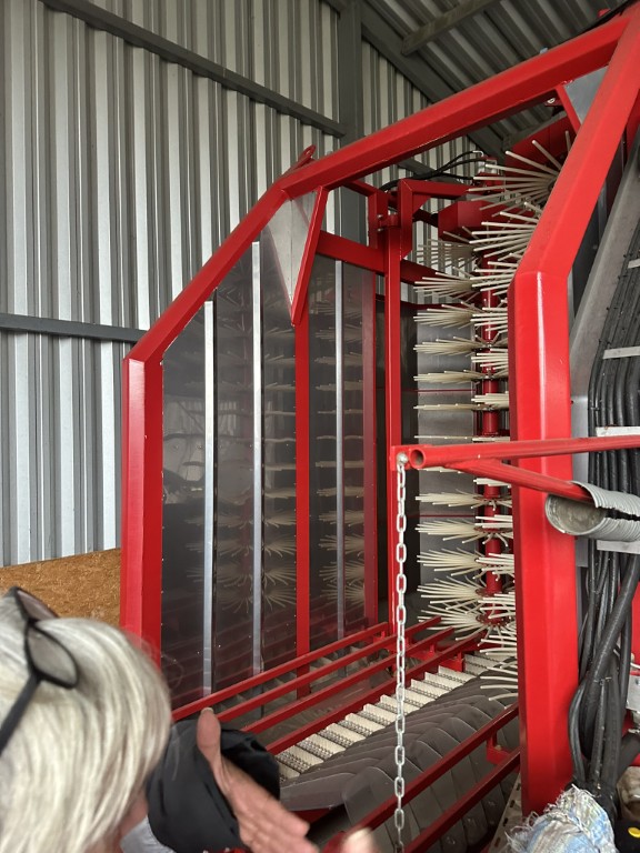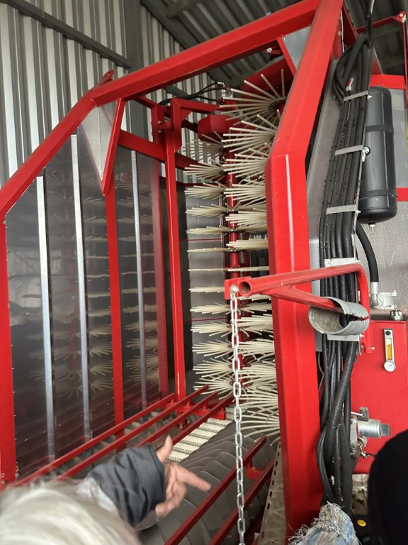 A meggykombájn működése külön figyelmet érdemel. A gépet egy Kubota traktor húzza, formája fordított U-betű: a fa a gép belsejébe kerül, a két oldalon halszálkás „pikkelyek” zárják körül a lombfalat. A belső küllők finom mozdulatokkal „fésülik le” a gyümölcsöt az ágról, a meggy a szállítószalagra hullik, onnan egy tisztítórész szívja le a leveleket, szennyeződéseket. A gyümölcsöt 500 literes konténerekbe gyűjtik. A gép úgy mozgatja az ágakat, hogy a vékony, rugalmas faanyag jól bírja, a túl vastag vázágakat viszont előre el kell távolítani. Ennek megfelelően alakították ki az egész ültetvényt: a klasszikus magányos koronás meggyfa helyett egy sűrű, több fából álló sövényt formáltak, ahol négy kisebb fa együtt ad ki egy „nagy fát”, csak gépbarát szerkezetben. A betakarítás így tiszta, kíméletes, a fa nem sérül, a gyümölcs pedig alkalmas ipari feldolgozásra.